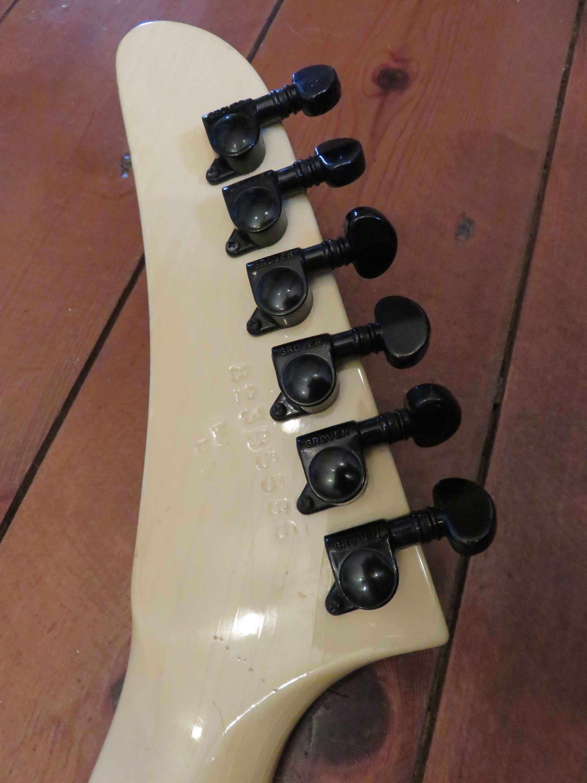This guitar has had a lot of touch ups to the paint work over the years, shows quite a bit of play wear and you can one of its owners names on the headstock under a blacklight so he must have cleaned that off at some point, maybe to sell the guitar.