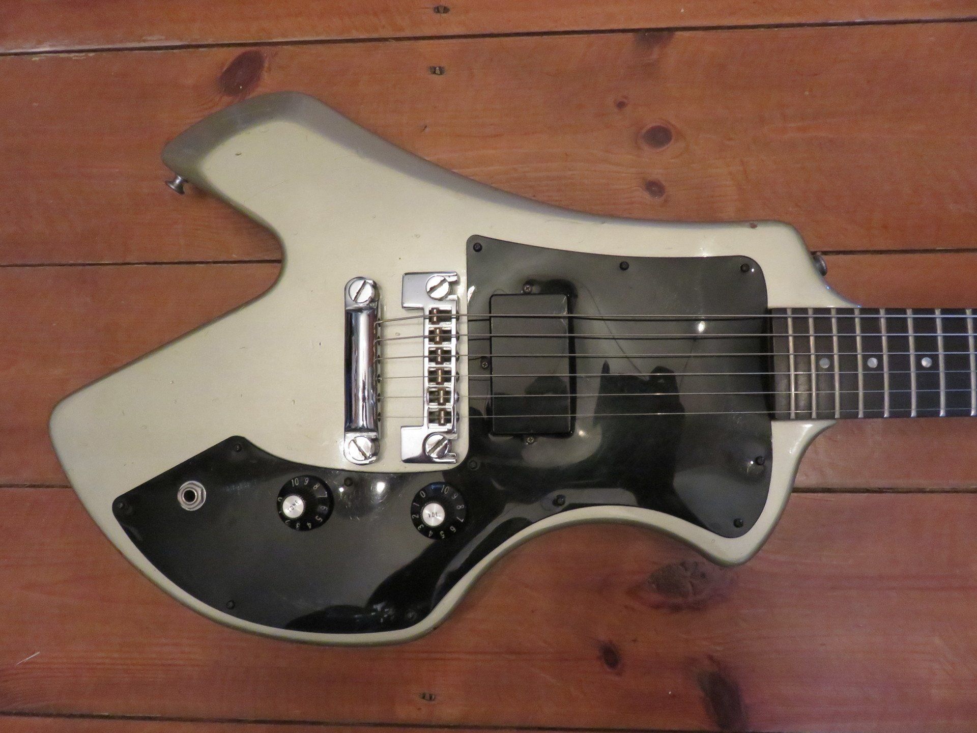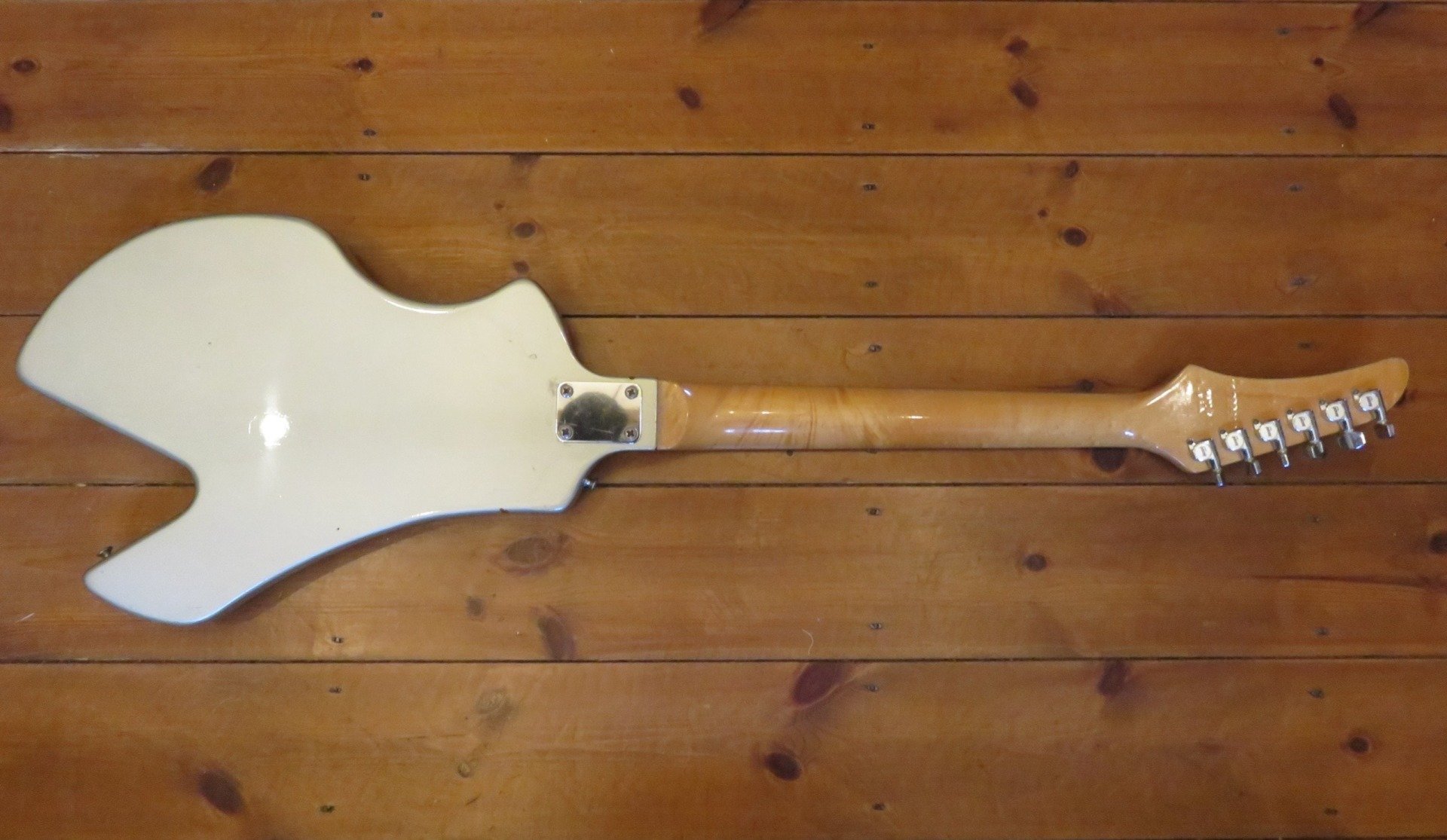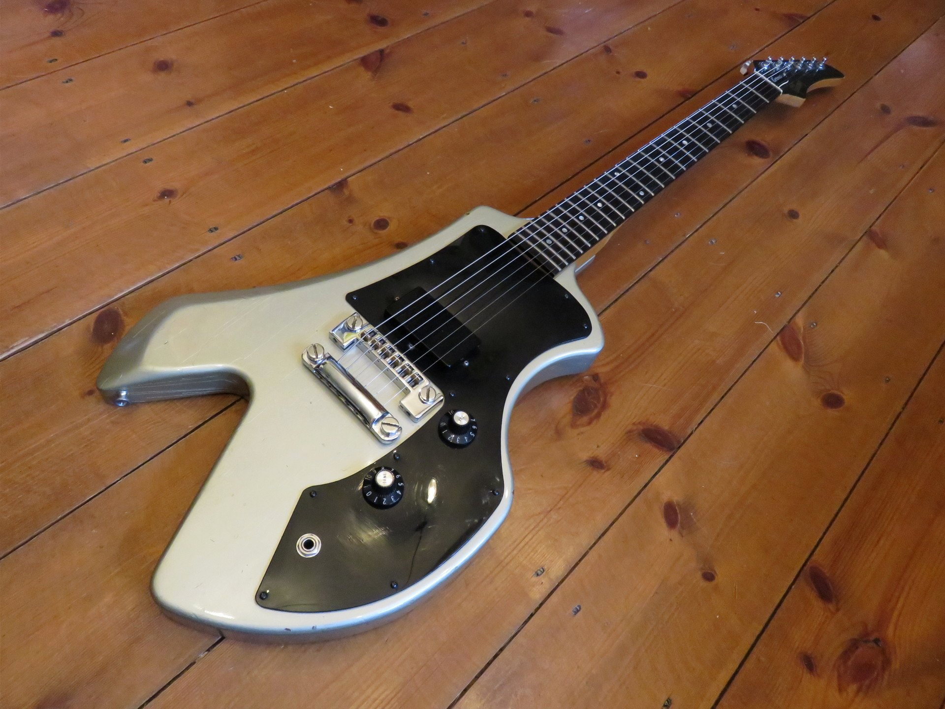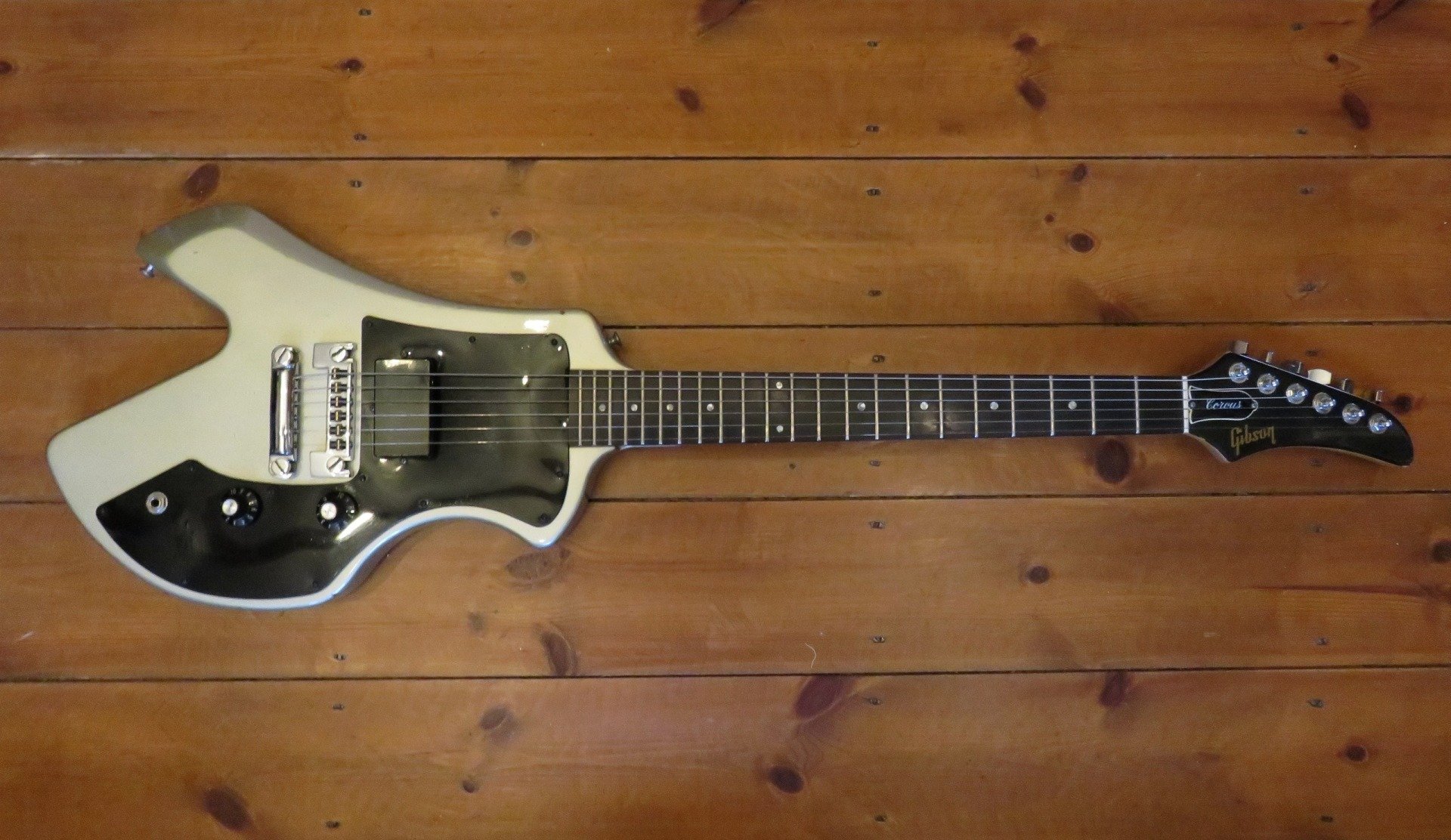 In the early 80s Gibson were trying anything to help the dwindling guitar sales of the their higher priced models by creating an array of cheaper guitars to contend with the Far East. The Corvus was one of those models, it now features in many "What Were They Thinking" articles. The weird shape is the result of it originally being designed as a headless guitar, so the tuners would have been located in the cutaway at the bodies base. But the bosses didnt like the idea of not having a headstock to put the brand name on, so the Corvus (meaning Raven in Latin) was born.